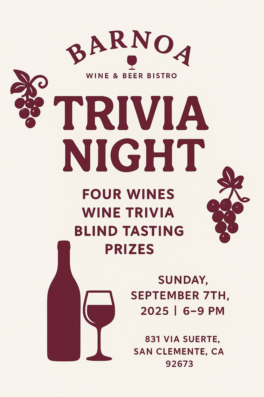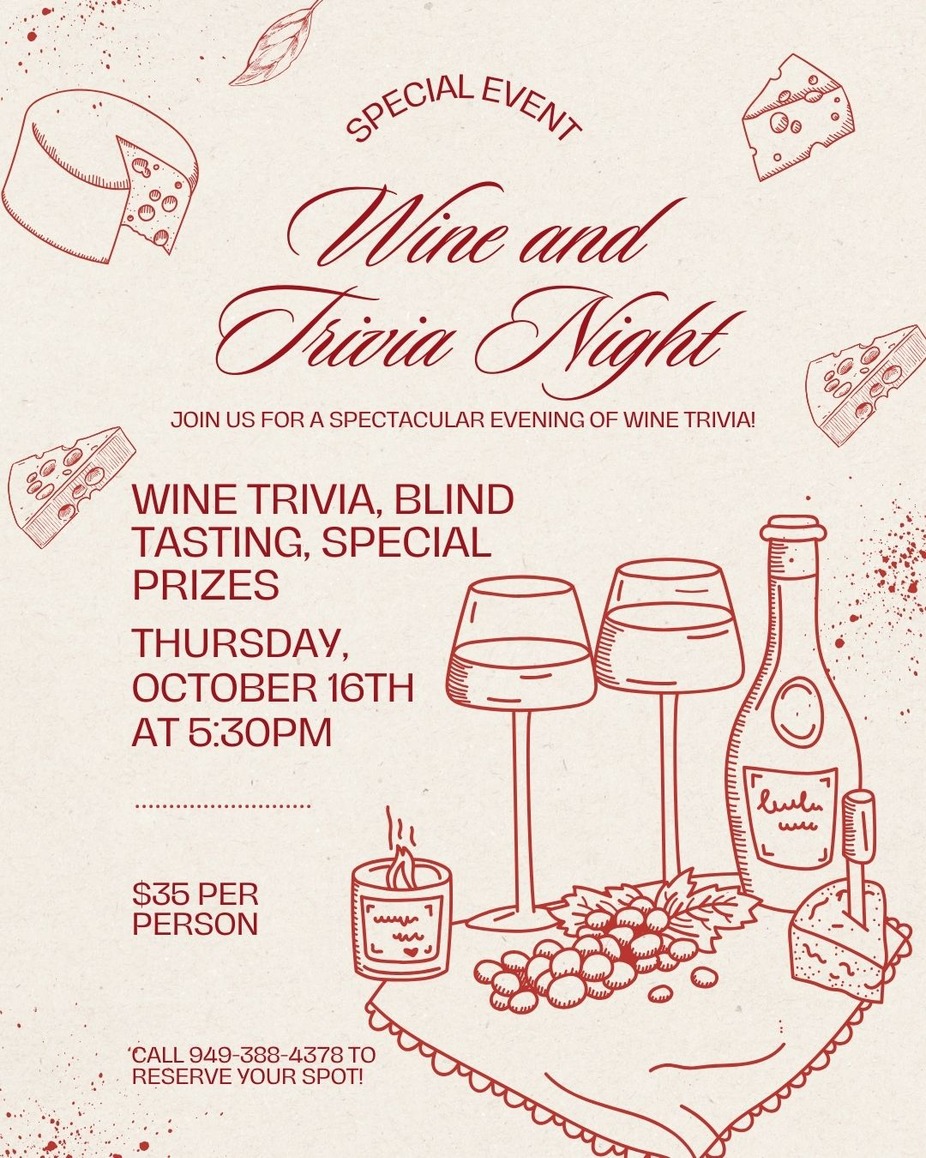 Take a trip with us (in our own backyard) and enjoy world-class wines from one of the most famous regions - Piedmont, Italy! Known for their Barolo and Barbaresco, Piedmont is home to some of Italy's most prestigious reds. $35 per person includes a flight of 5 wines plus a small plate of cheese and crackers to prime the palate. Please call 949-388-4378 to reserve your spot!